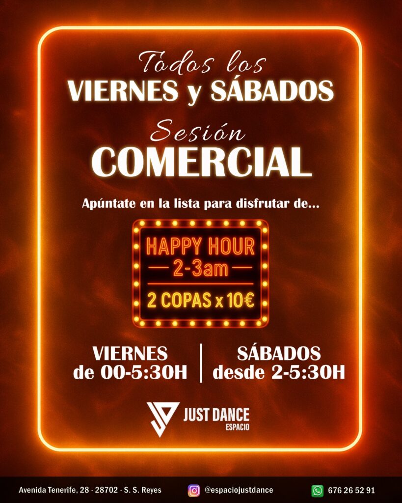 Todos los viernes a partir de las 00:00H hasta las 05:30H y los sábados de 02:00H hasta las 05:30H disfruta de una fiesta con la mejor música y bebidas de la Comunidad de Madrid. Tiene una Happy Hour de 02:00 a 03:00 donde tendrás 2 Copas por 10€.