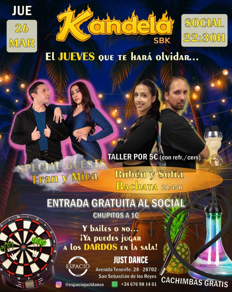 Todos los jueves son de Kandela SBK en Espacio Just Dance. Tienes dos talleres de baile: Kizomba y Bachata y un Social SBK de lo mejor, con música que te hará bailar hasta el amanecer.